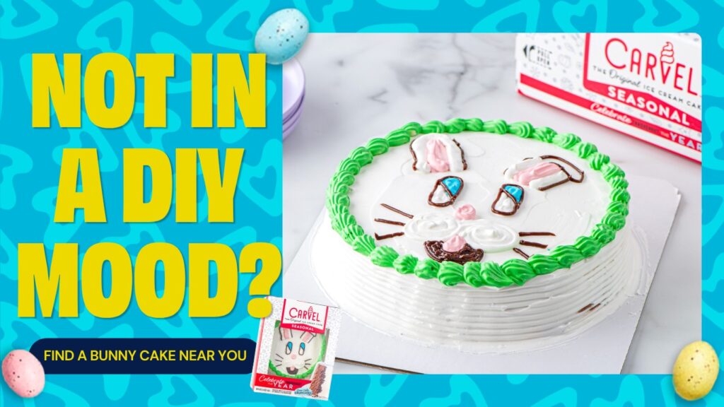 Not in a DIY mood? We’ve got you covered. Grab a Carvel ice cream cake from the freezer and head to your grocery store’s bakery section, most stores can add a custom message on your cake without any advance ordering (we’re loving “Hoppy Easter” as our go‑to). Or keep it simple with our pre‑decorated Easter Bunny Cake, ready to celebrate straight out of the box. Visit our product locator to find a grocery store near you and bring home the perfect Easter dessert for your family gathering.